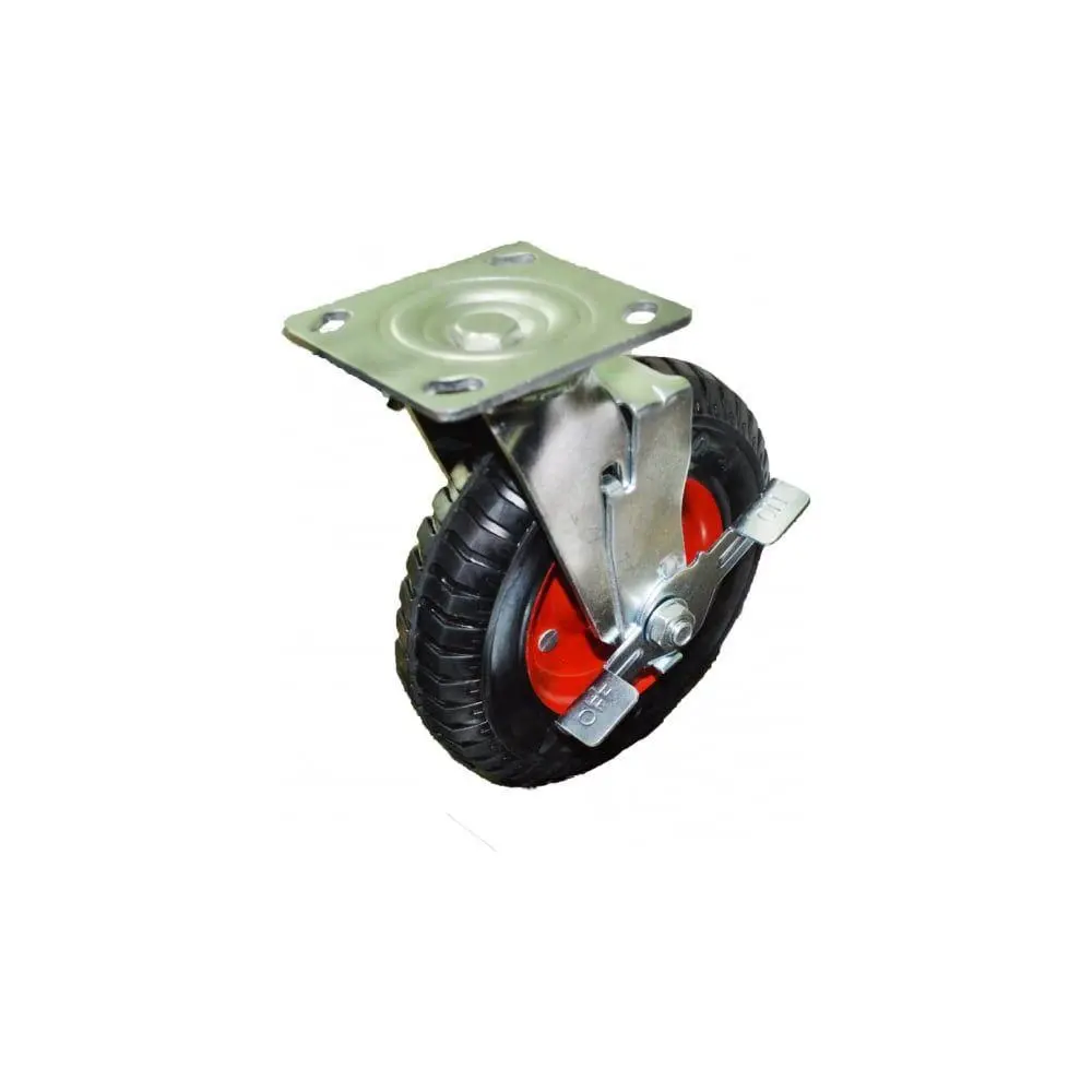 Тракторный рисунок протектора позволяет использовать литые колеса на любых покрытиях, включая грунт, асфальт и бетонные полы. Тормоз надежно фиксирует оборудование даже на наклонных поверхностях. Красный стальной диск обеспечивает жесткость и не деформируется при превышении допустимых нагрузок.