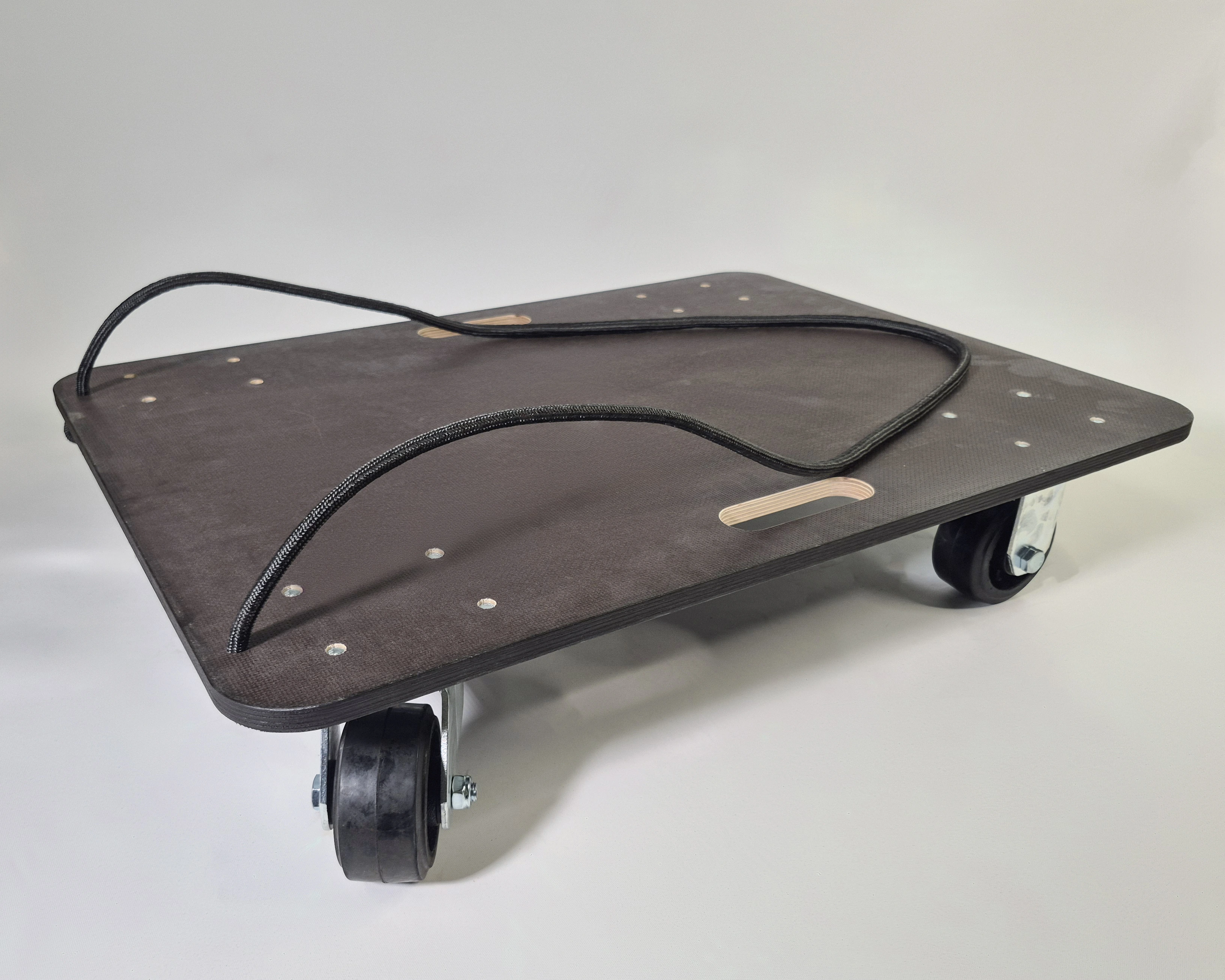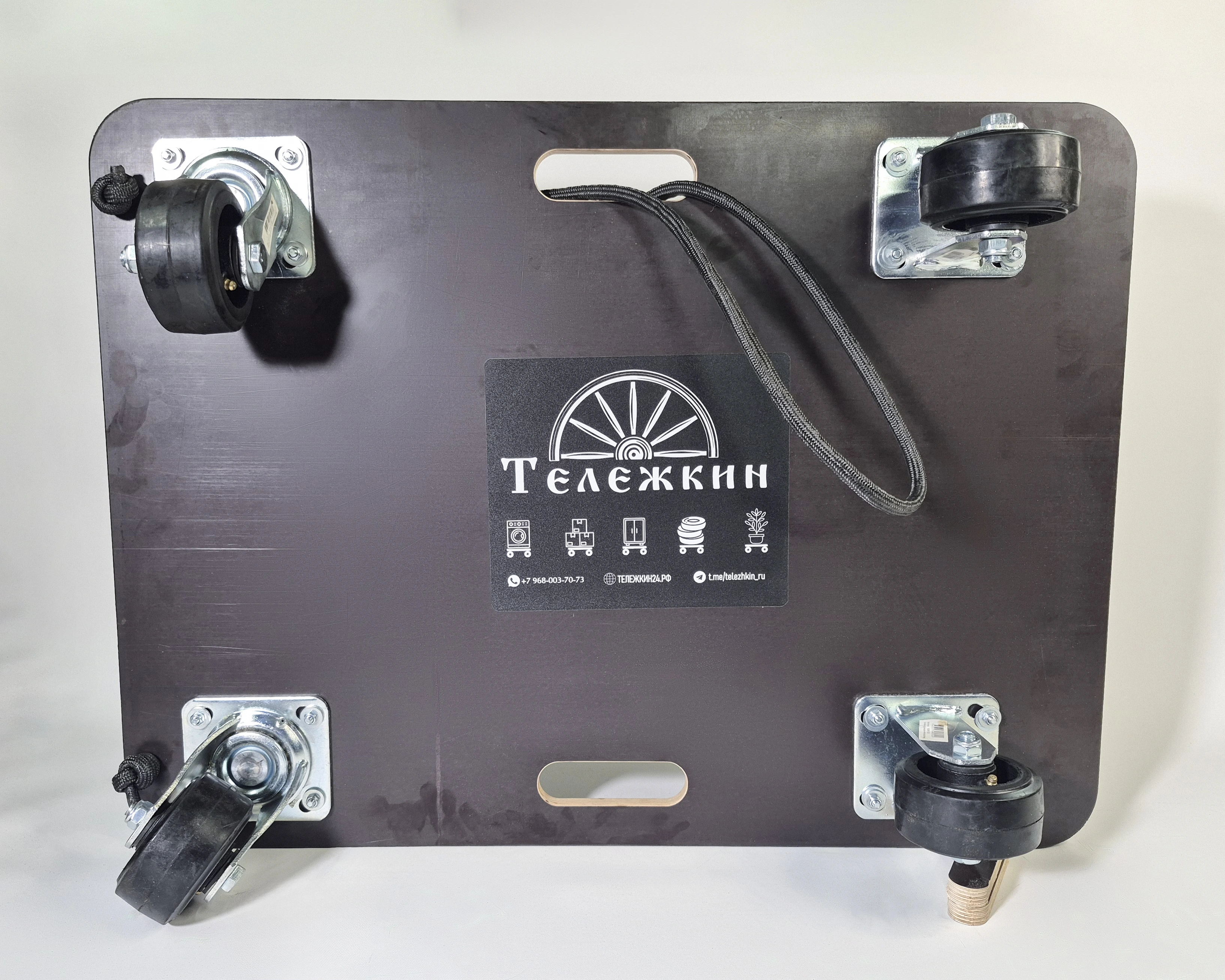 Тележка изготовлена из ламинированной транспортной фанеры толщиной 15 мм, что обеспечивает прочность и долговечность конструкции. Поверхность платформы имеет специальное противоскользящее и водоотталкивающее покрытие, а эргономичная ручка облегчает переноску. В комплект входит надежный прочный трос длиной 2 метра.