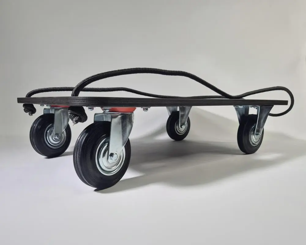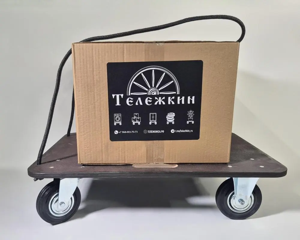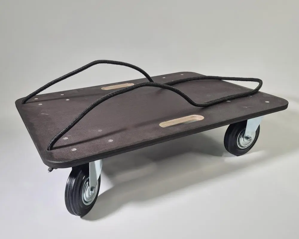 Тележка изготовлена из ламинированной берёзовой фанеры толщиной 15 мм. Поверхность платформы имеет специальное покрытие, которое предотвращает скольжение и защищает от влаги. Эргономичная ручка облегчает переноску тележки.