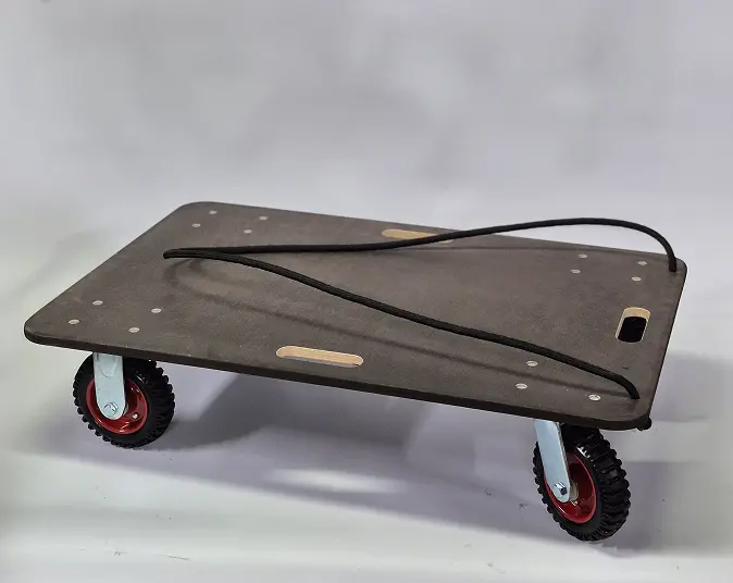 Тележка изготовлена из ламинированной транспортной фанеры толщиной 15 мм, что обеспечивает прочность и долговечность конструкции. Поверхность платформы имеет специальное противоскользящее и водоотталкивающее покрытие, а эргономичная ручка облегчает переноску.